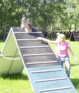 Šikmá stěna neboli áčko se také řadí mezi „zónovky“. Pro kategorii large je vysoká 190cm při úhlu 90°, který mezi sebou svírají obě části. Pro kategorie medium a small se stěna rozevírá tak, aby její výška činila 170cm. Zóny mají délku 106cm. Houpačka je jedna z velice atraktivních překážek. Její délka je přibližně 4m, zóny jsou stejné jako u kladiny. Pes musí vyběhnout za polovinu, počkat, až se houpačka převáží, a poté seběhnout. Poslední tak trochu zvláštní překážkou je stůl. Je to čtverec o straně 90 až 120cm. Pro kategorii small je vysoký 35cm, pro kategorii large 60cm. Pes na něj musí skočit a 5 sekund zůstat. Po uplynutí této doby může stůl opustit a běžet dál.